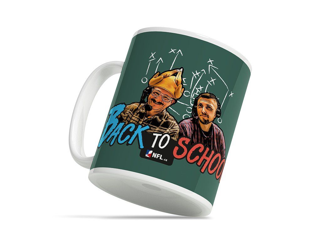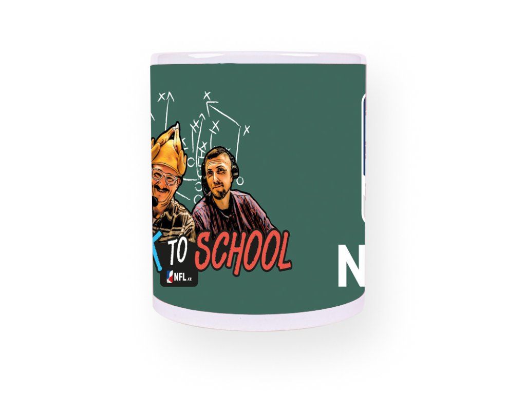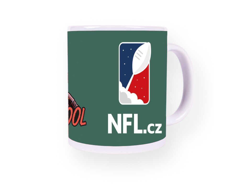 Hrnček zelenej farby s logem Back to School a farebným logom NFL.cz.
